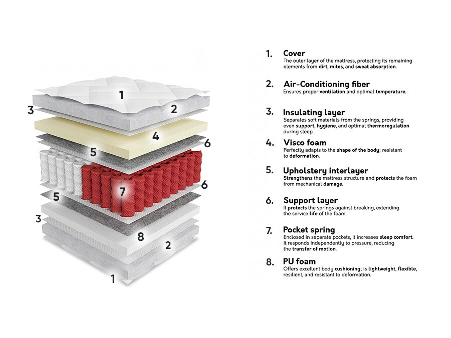 Takođe je važno napomenuti da se otisci dušeka (do približno 2 cm) ne smatraju greškom u proizvodnji. Tokom pakovanja, dušek je čvrsto sabijen kako bi se osigurala zaštita, što može rezultirati malim varijacijama veličine. Kada se odmota i upotrebi, dušek će se vratiti u prvobitne dimenzije. Pored toga, zbog zatvorenog pakovanja, specifičan miris tipičan za nove proizvode može biti primetan u početku – on će nestati u roku od nekoliko dana. Koristite dušek sa podnožjem kreveta koji ima blisko raspoređene letvice. Lamele obezbeđuju amortizaciju, smanjujući pritisak na telo, dok mali razmaci između njih obezbeđuju pravilnu cirkulaciju vazduha i pomažu da se produži životni vek proizvoda.
