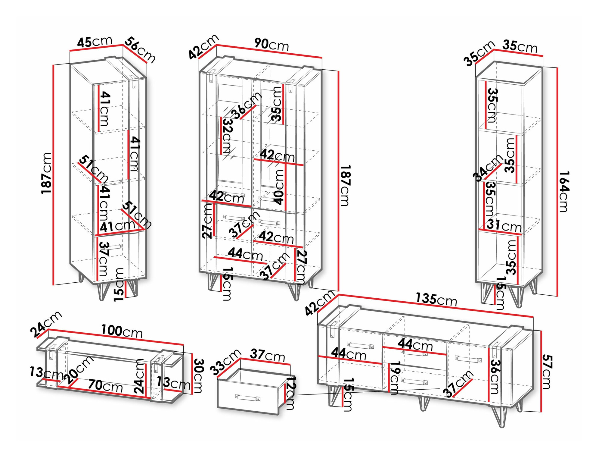 1870 x 450 x 560; 1870 x 900 x 420; 1640 x 350 x 350 mm