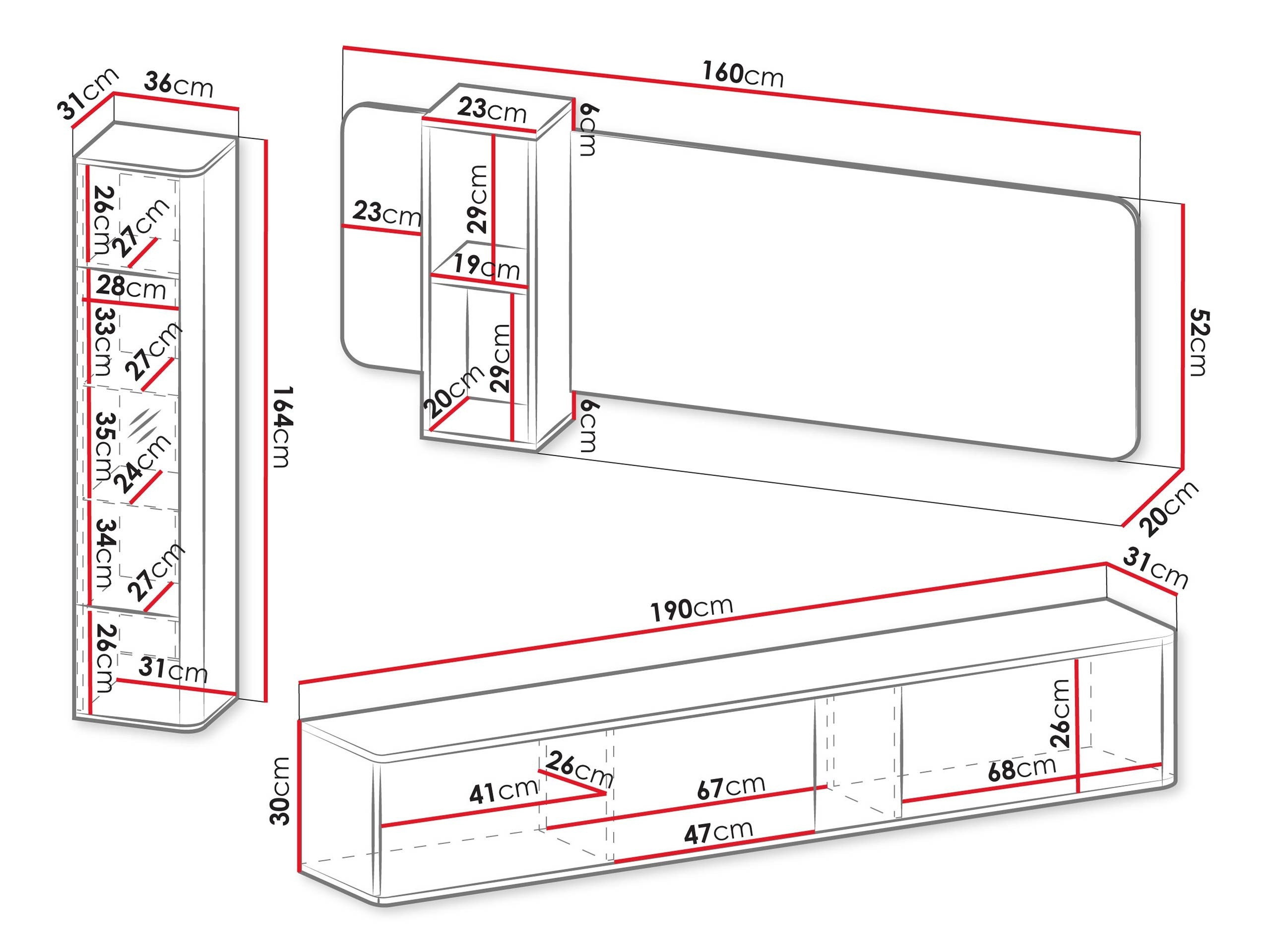 164 x 36 x 31; 52 x 160 x 20 cm