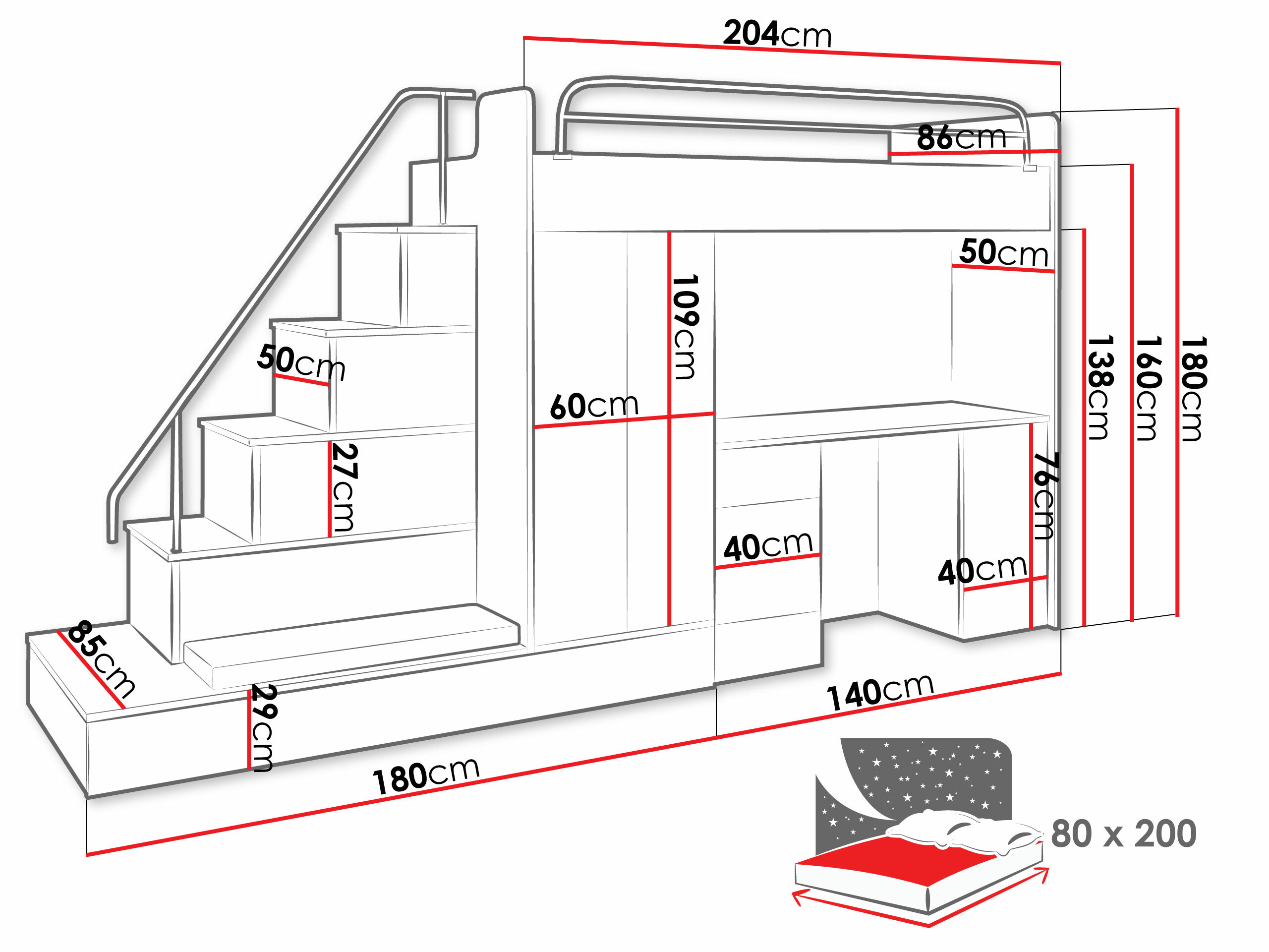 - 80 x 200 cm