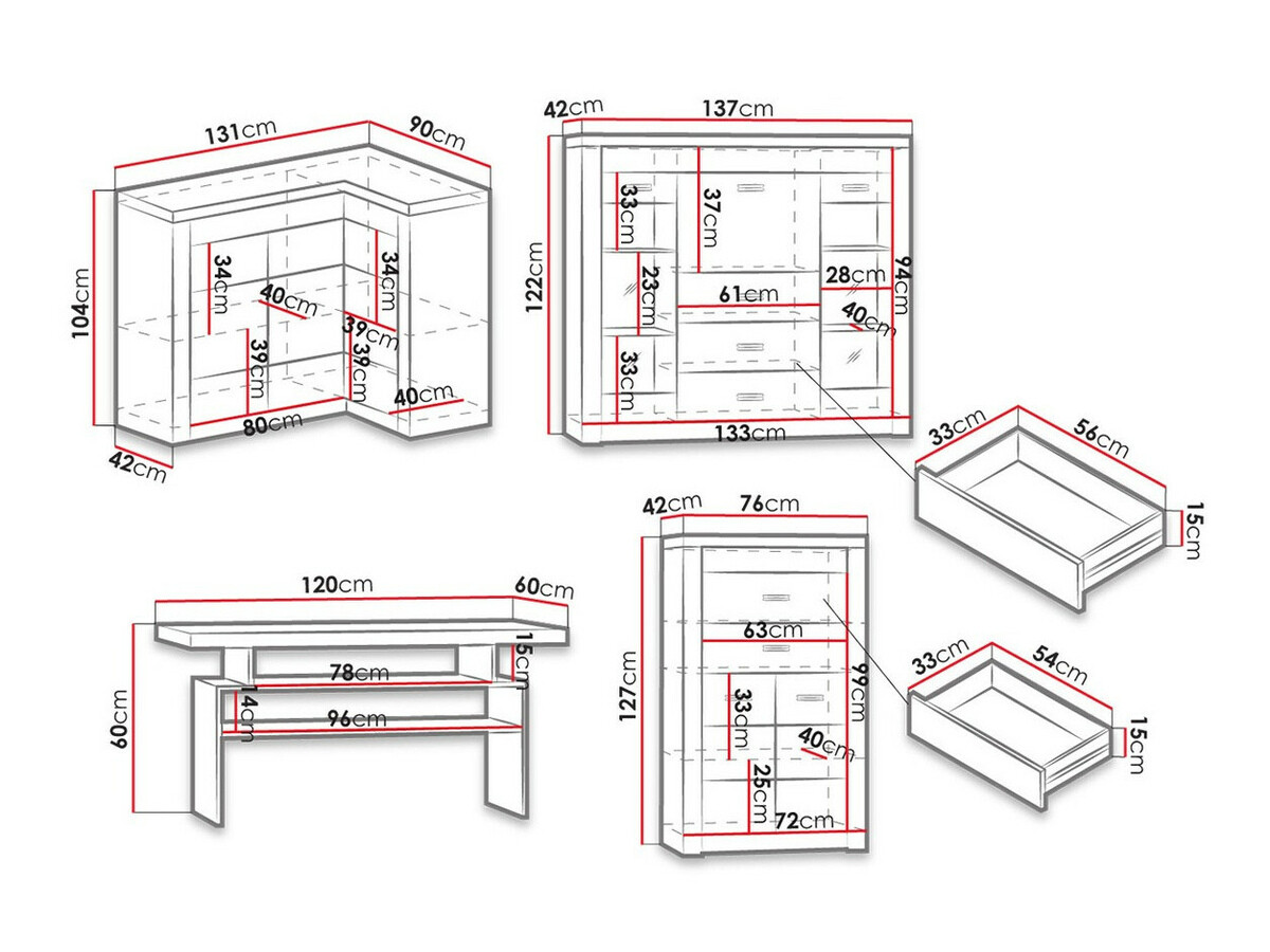 1270 x 760 x 420; 1040 x 1310 x 420 mm