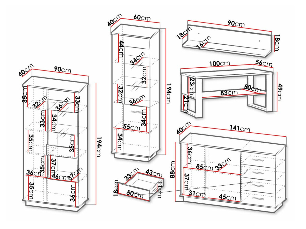 194 x 90 x 40; 194 x 60 x 40 cm