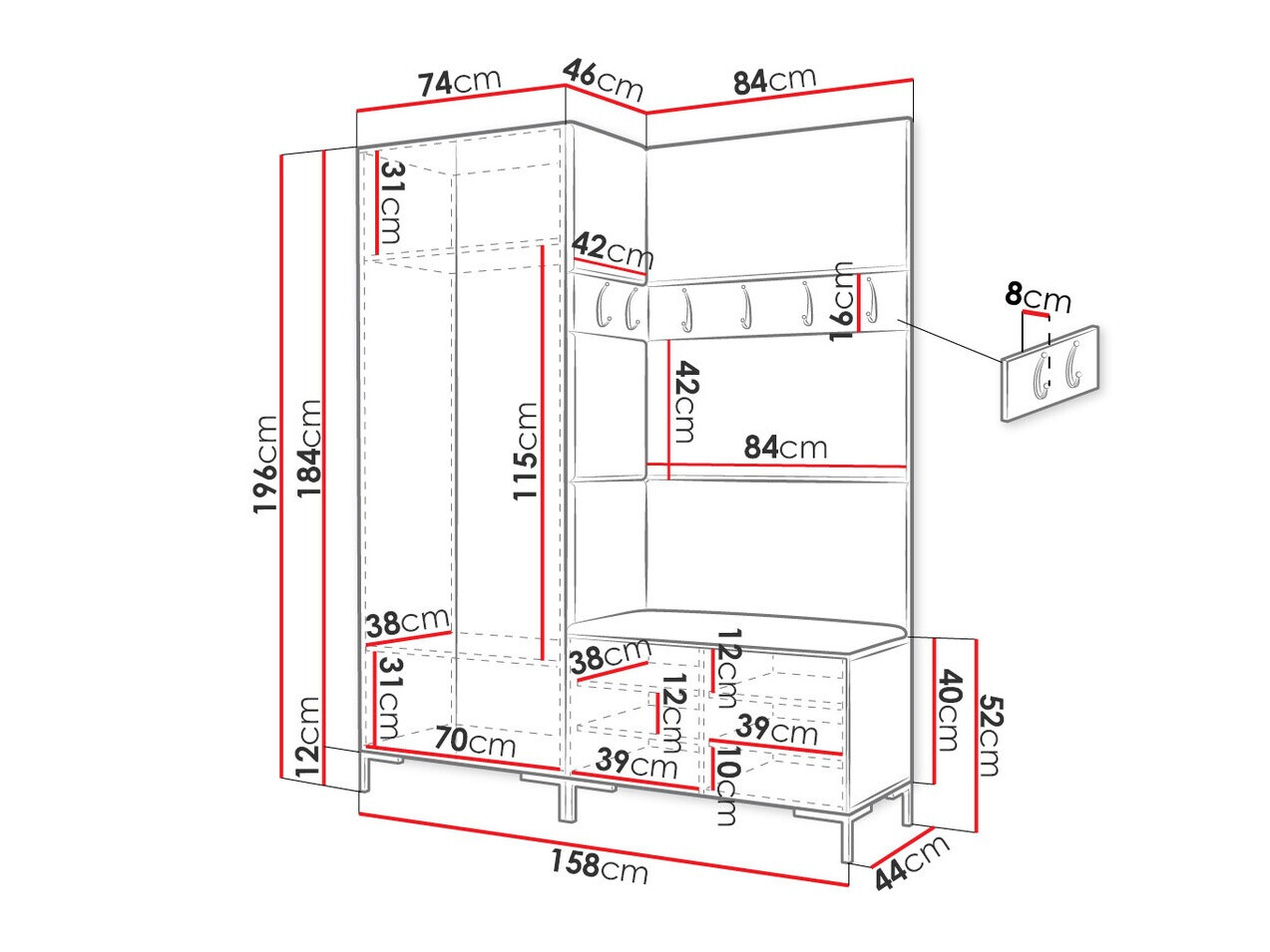 196 cm  158 cm  44 cm