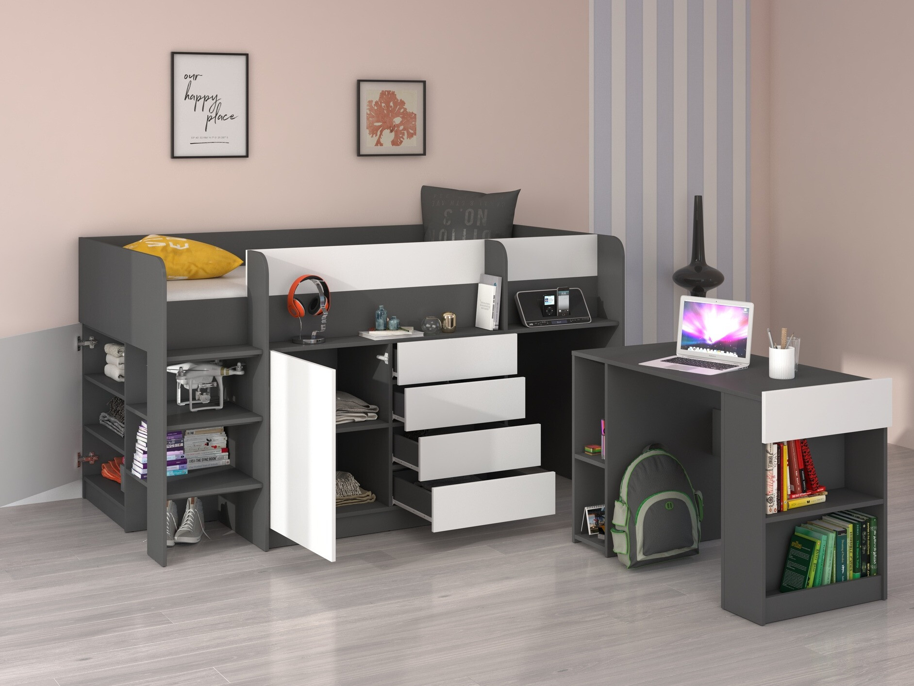 Намештај није одличног квалитета, али је пажња након куповине од стране фурнитуре.ес била фантастична. Иако монтажа траје дуго, разумљиво је, а дрво је такође означено према упутству. Мали је одушевљен, има и "склониште" позади где му се приступа из рупе на радном столу :-)